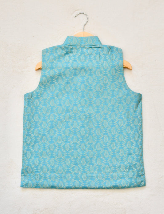Boys Silk Nehru Jacket / Waistcoat- Light Blue & Gold