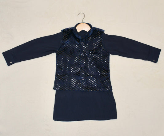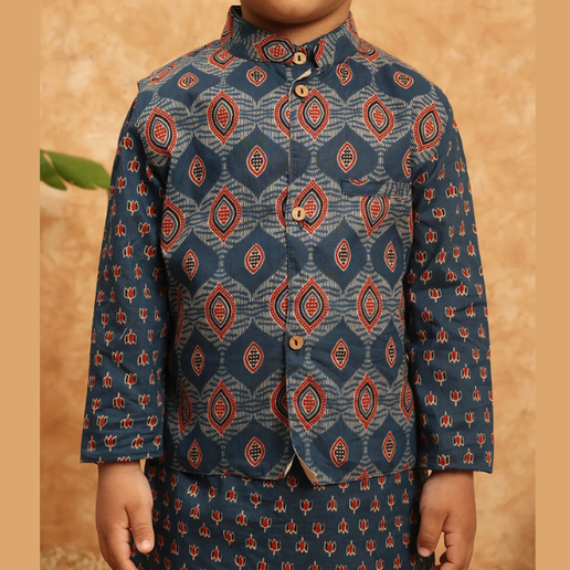 Boys Cotton Kurta & Pyjama with Nehru jacket - Ink Blue & white