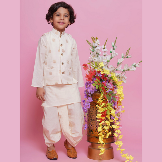 Boys Cotton Full Sleeves Ambi Embrodiery Nehru Jacket with Kurta and Dhoti - Cream