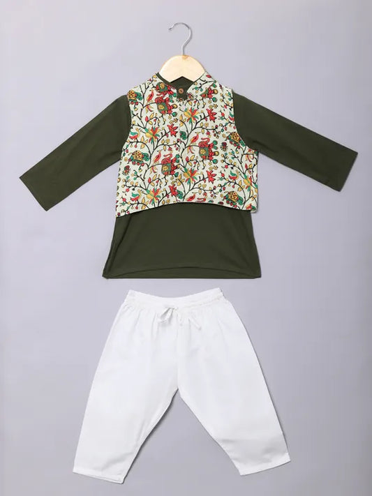 Boys Cotton Kurta & Pyjama with Nehru jacket - Mehndi Green
