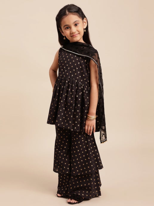 Black & Gold Print Sharara Kurti With Dupatta