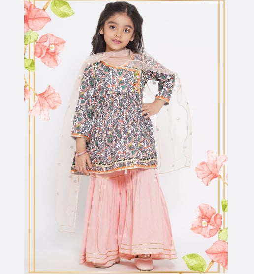 Angrakha Kurti with Sharara & Dupatta - Peach