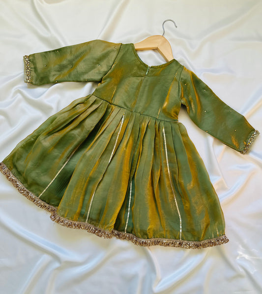 Girls Frock Style Kameez with Pants & Dupatta - Olive Green & Gold - Infant