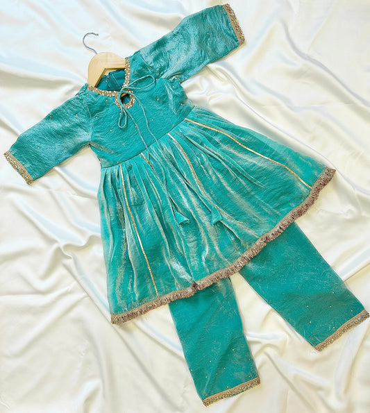 Silk Gharara & Kameez Set with Dupatta - Peacock Green - Infant
