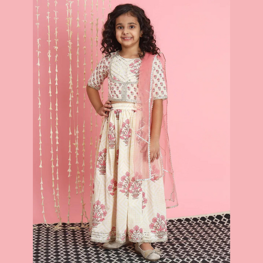 Straight Style Cotton Fabric Cream Color Lehenga Choli With Dupatta - Infant