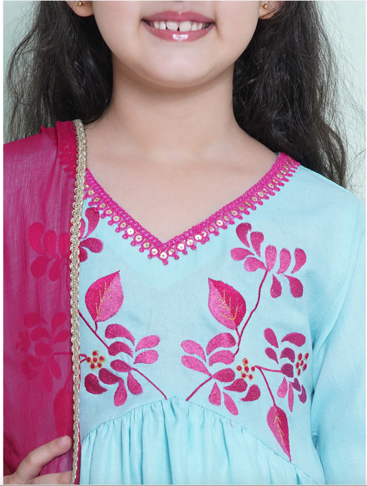 Girls Embroidered Kameez with Trousers & Dupatta - Pastel Blue