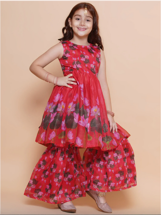 Girls Red & Black Floral Printed Frock Style Kameez with Sharara